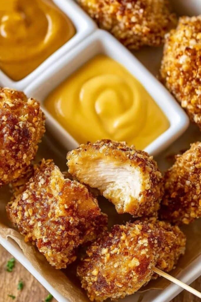 When making Pretzel Crusted Chicken Bites, the type of pretzel matters. You want something that gives you that satisfying crackle. Traditional salted pretzel rods or twists work best — they break down into coarse crumbs that cling beautifully to the chicken. Steer clear of flavored varieties unless you’re intentionally adding flavors like honey mustard or cheddar into your coating.