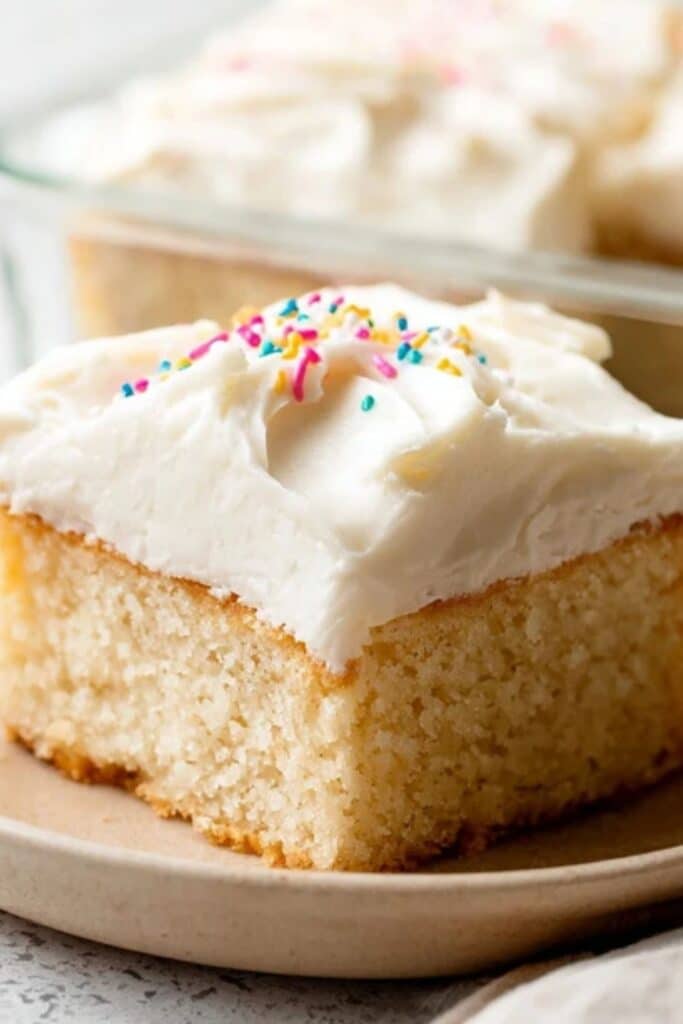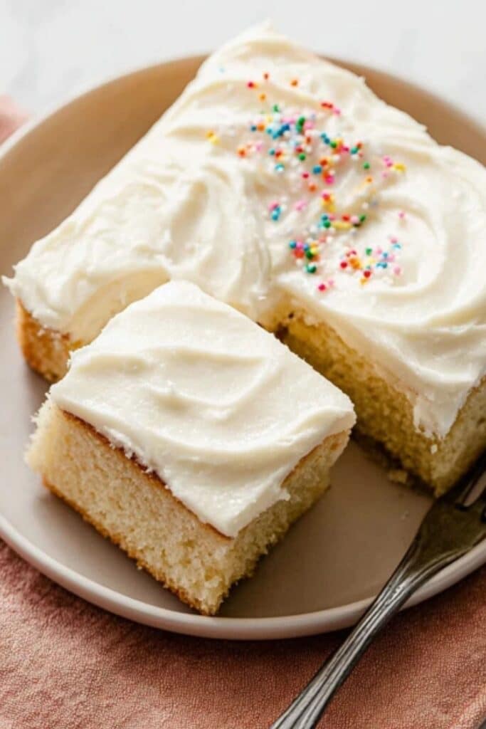 Vanilla sheet cake with whipped buttercream frosting is great for potlucks and parties. Cut into clean squares using a warm knife for crisp edges. For best storage, cover with foil or plastic wrap and refrigerate. It stays fresh for 3–4 days.